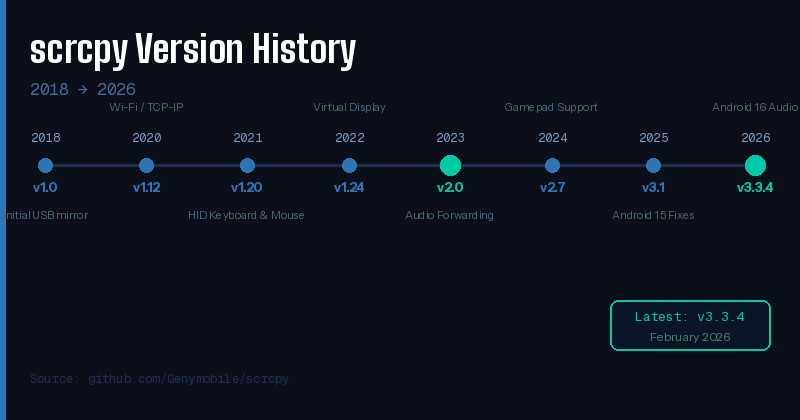 Figure 3: scrcpy version timeline — v1.0 (2018) to v3.3.4 (2026)