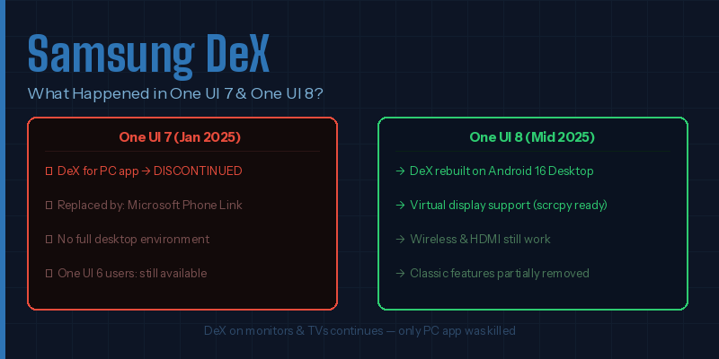 Samsung killed DeX for PC (the Windows app) with One UI 7 in January 2025. DeX itself continues on monitors and TVs. One UI 8 rebuilt DeX on Android 16 Desktop Mode — but removed several classic features. The original PC app is permanently discontinued.
