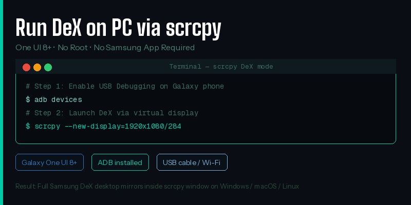 Yes — on Galaxy devices running One UI 8 or later, running scrcpy –new-display=1920×1080/284 launches DeX mode in a virtual display that mirrors to the PC. Works on Windows, macOS, and Linux without root or any Samsung software.